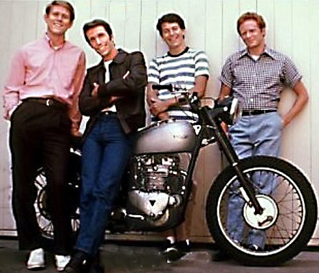 Hey, it’s the Fonz – Heyyy! King of Cool riding British Iron in Milwaukee; home of Harley Davidson.