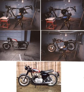 I chose a cafe racer look with rear sets and clip on handlebars; it ran like a champ and had that wonderful twin rort. However no easy place to store and difficult insurance forced it to be sold to another owner.