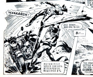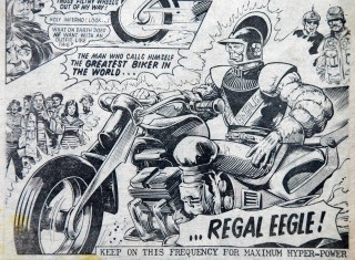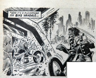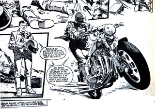 Another early story involved the invasion of Britain by some ficticious Eastern Block country called Volga; it took the rough edged resistance leader, Bill Savage, a lorry driver armed with his shotgun and working class quips to save the day. However the Volgs were armed with fast sportsbikes equiped with machine guns.