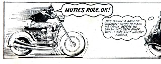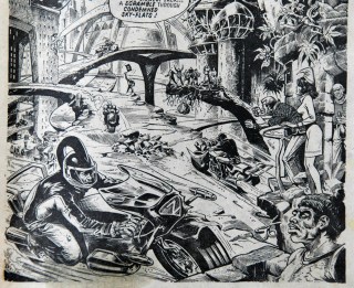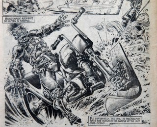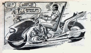 One of the outstanding pieces graphically was the story Inferno; loosely based on the movie Rollerball (the sublime 1975 version NOT the 2002 one!). A future sport being a mix of Football, Basketball, Baseball, Speedway, MotoCross, Kung-Fu based in an arena of cinders with jetpacker flyers and a healthy dollop of ultraviolence thrown in. Artie Gruber being one classic character. Massimo Belardinellis bikes were sumptuous choppers with outlandish engineering and cool riders with harpoon-line powergloves. Sadly the plug was pulled due to the overly violent nature of of the action.