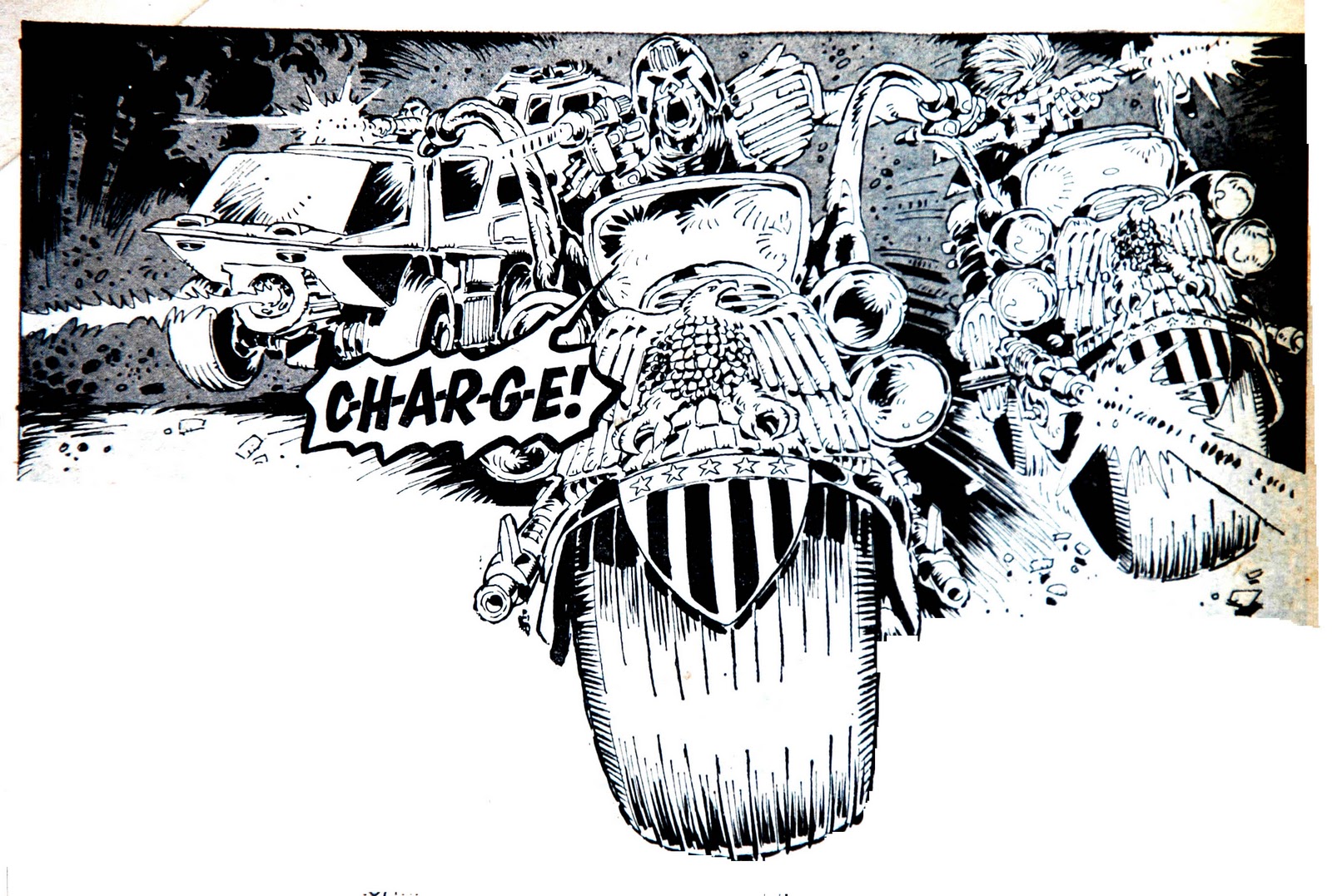 Back in the late seventies I read the then new comic 2000AD ~ fantastic and violent stories of the near future. Classic artwork by the likes of Pino, Ezquerra, Bolland and Belardinelli graced the pages. I would devour these stories again and again until the pages were threadbare. I would then draw the action scenes and allow the oft featured bikes to soak in to my subconscious. One early story M.A.C.H. 1 centered around a character called John Probe, with superhuman strengths (man activated by compu-puncture hyperpower! `~ “Six Million Dollar Man”?) Many of his stories involved bikers on the top models at the time, as well as a few fantastical ones.