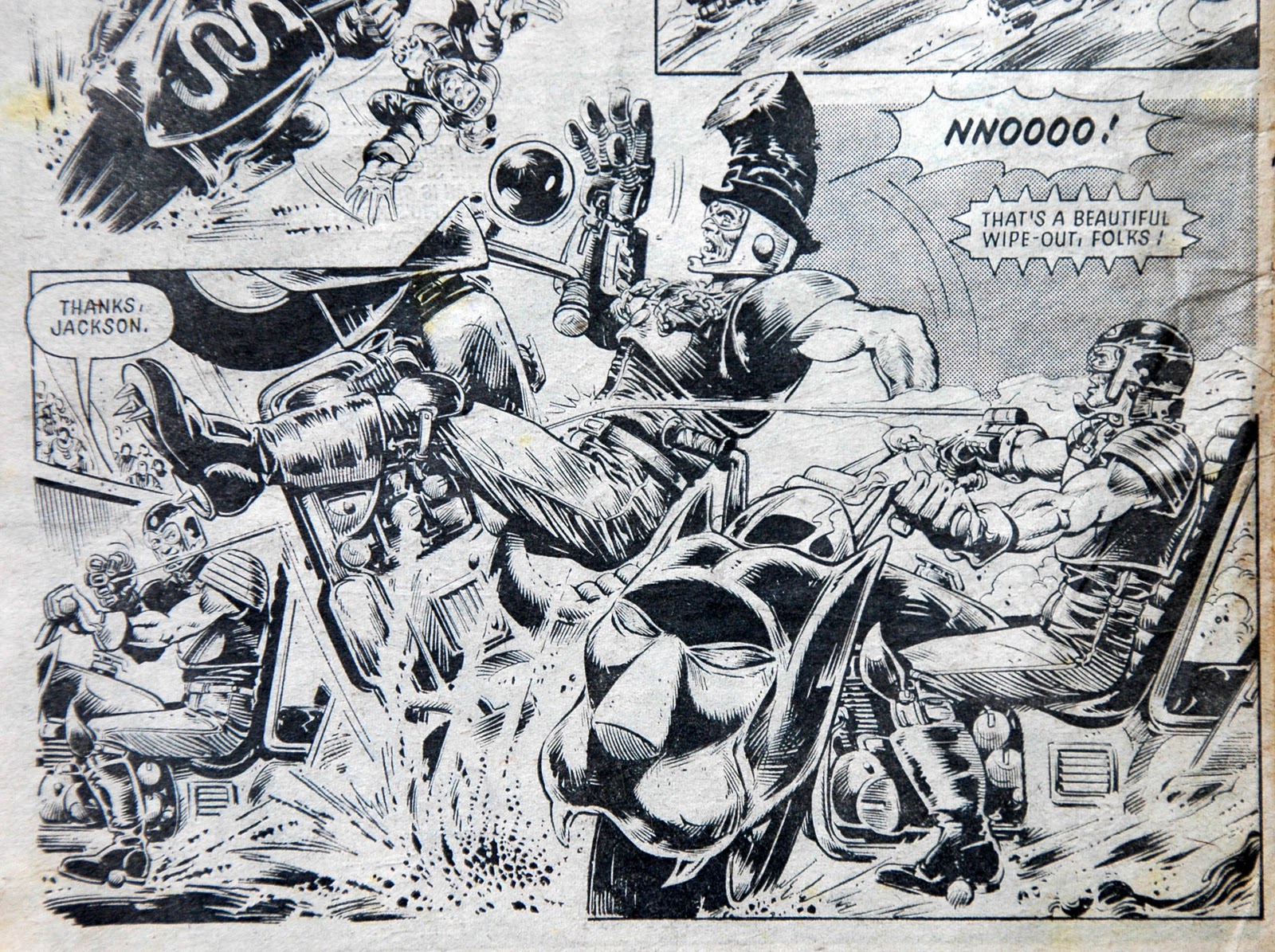 Another early story involved the invasion of Britain by some ficticious Eastern Block country called Volga; it took the rough edged resistance leader, Bill Savage, a lorry driver armed with his shotgun and working class quips to save the day. However the Volgs were armed with fast sportsbikes equiped with machine guns.