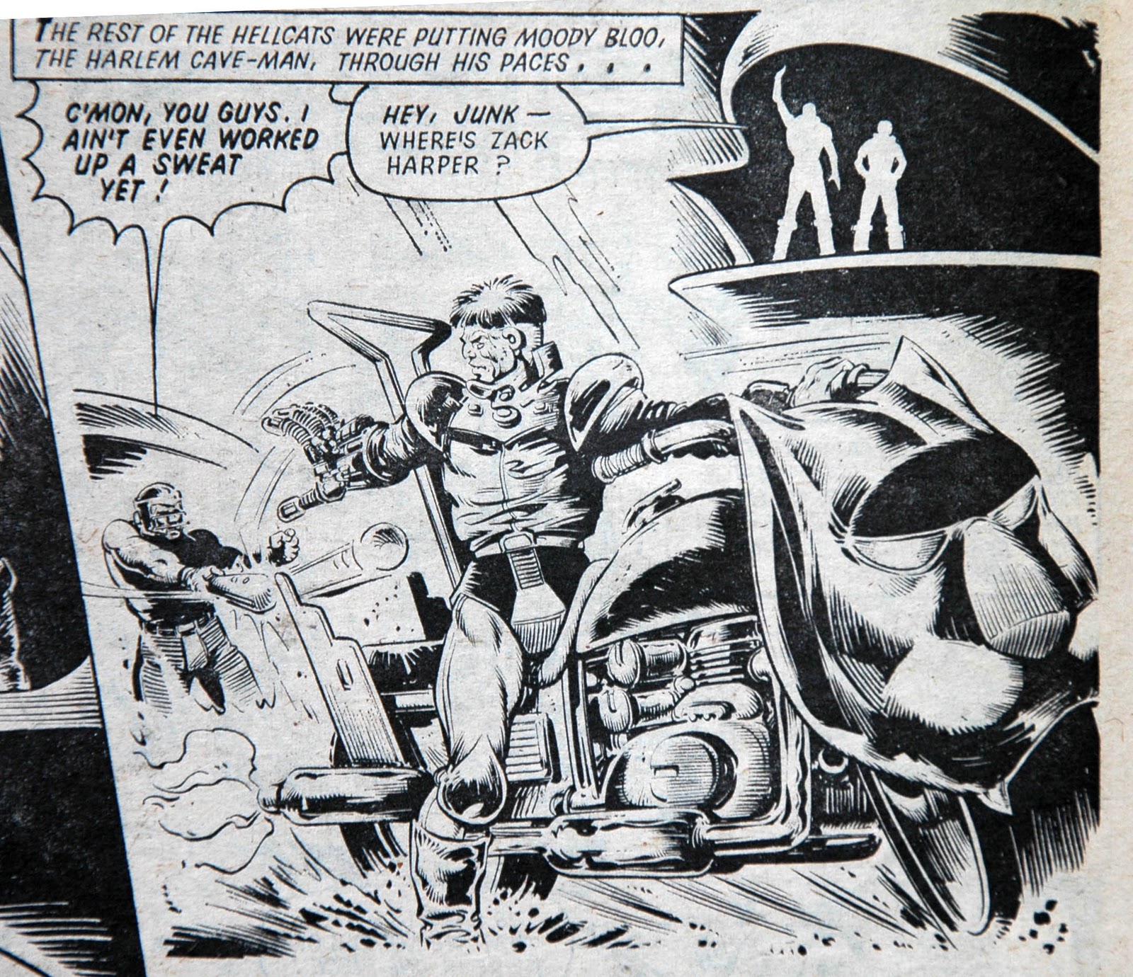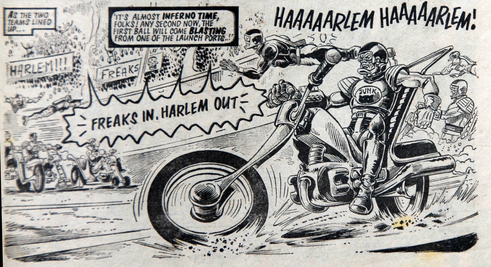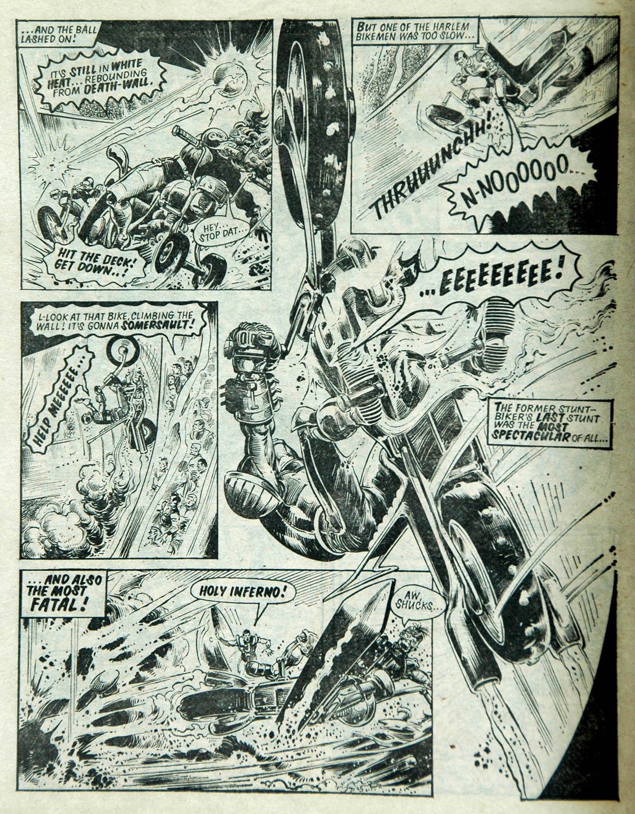 One of the outstanding pieces graphically was the story Inferno; loosely based on the movie Rollerball (the sublime 1975 version NOT the 2002 one!). A future sport being a mix of Football, Basketball, Baseball, Speedway, MotoCross, Kung-Fu based in an arena of cinders with jetpacker flyers and a healthy dollop of ultraviolence thrown in. Artie Gruber being one classic character. Massimo Belardinellis bikes were sumptuous choppers with outlandish engineering and cool riders with harpoon-line powergloves. Sadly the plug was pulled due to the overly violent nature of of the action.