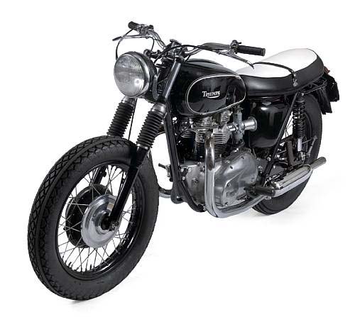 Here’s a beautiful lightly custom Triumph, bobbed and given a nice monochromatic appearance centered on a tank painted and pinstriped by the hand of Von Dutch (a.k.a. Kenny Howard); motorcycle and hotrod custom painter and pinstriper extraordinaire from the sixties. This bike sold recently at an auction of Bud Ekins items by Bonhams.