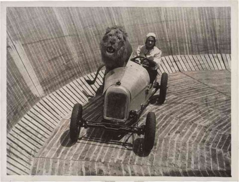 Just love this picture, the wind blowing through the lions mane is priceless; not sure what the bike is, sometimes the light but powerful Triumphs were put into action on these motordromes.