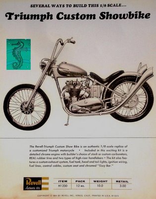 Well, a Revell model kit of a Triumph in chopper fashion; with, it seems options for customization…