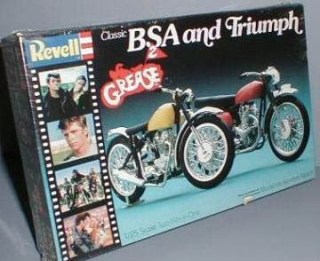 There are quite a few plastic model kits featuring the Triumph motorcycle, whether for historical significance, such as the red-caps machine, or TV promotion. Different scales and models… starting with this brit duo: BSA and Tri, from the Grease 2 movie (apparently!)