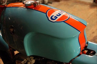 Here’s a beautifully detailed cafe racer prepared in glorious blue and orange. Thiunassuming rebuilt 1975 model has been methodically reconstructed with special care to details such as the sumptuous tank, tail section and he controls.