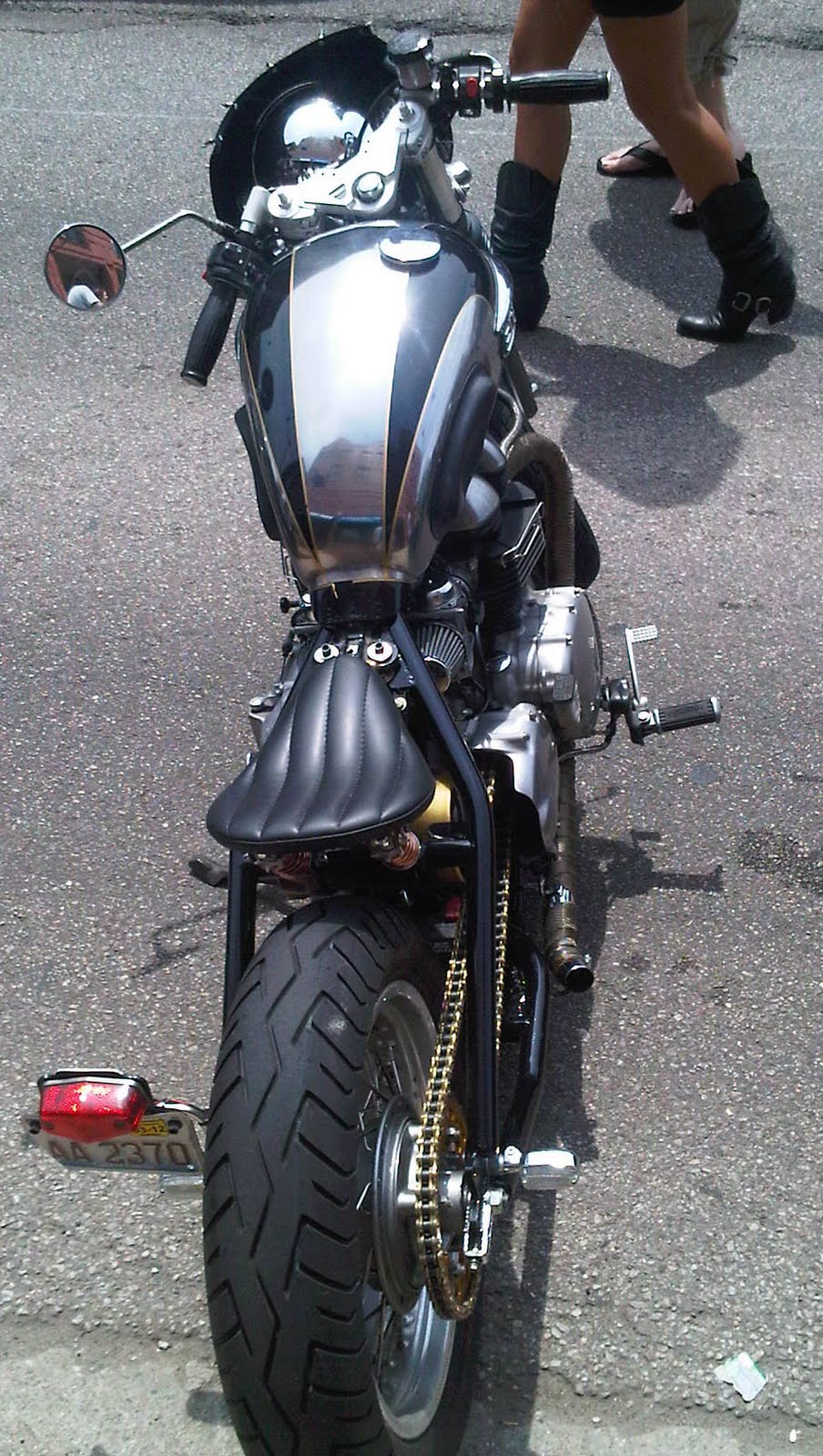 …and finally, a bobbed Triumph. Hardtail and sprung saddle; though clip-ons and forward placed footrests may make an awkward seating position. But obviously a well-loved ride.