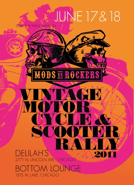 Some neat ‘Flyers’ were prepared to promote the show; Mods vs Rockers as the inspiration. A BSA Goldie for the backdrop in neon pink and orange is inspired. Nice clean poster.