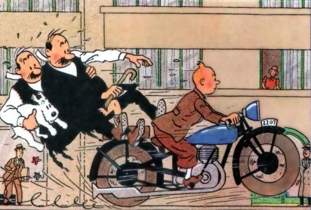 The Thompson Twins and Snowy take fright as our intrepid hero de jour takes flight on his motorcycle.