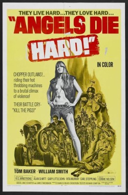 Fab seventies movie poster graphics: like the movie trailer in image form, all the high impact scenes in one swoosh of flame. The female protagonist astride it all! The front wheelie spun bike is an English Twin: woo-hoo!