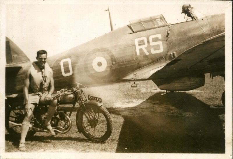 An airman in WWII sitting proudly with his Royal Enfiled, oh and his Hawker Hurricane in the background. The Battle of Britain pilots relaxed aboard speedy motorcycles.