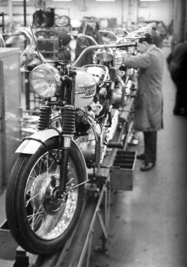 Here’s an evocative shot taken of the assembly line in the Meriden workshop. The pieces come together to create a machine where the sum greater than the parts. A Golden Age of the British motorcycle industry soon to wane only to re-emerge like a phoenix from the ashes to where it stands as a proud builder of Brit-Motos!