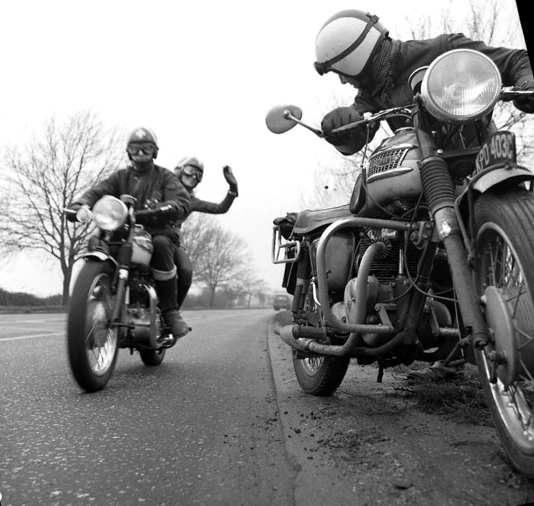 None of this fair-weather cruisin’ for the lads and lasses in blighty! For the autumn and winter months in you need to wrap up and get out on the roads. Pannier rack and caked on road grime for the ’65 moto at the side of the road shows a rider intent on getting out for a no matter what. The damp pavement surface, leafless trees, grey misty distance; I feel a need for a warming cuppa at the transport cafe down the road! “Make it a pint of tea; milk, no sugar!”
