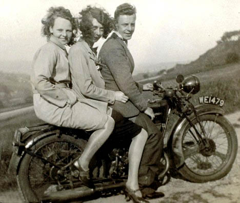 Ralph and Phyllis met in 1925 on a street corner in Sheffield, he worked in the steelmills of the Don Valley; they finally married in 1933 and have remained happily so ever since. On the meager wage of £3 per week they invested in a Triumph motorbike which he rode with Phyllis all over on, and, as this picture shows, with her sister Muriel.