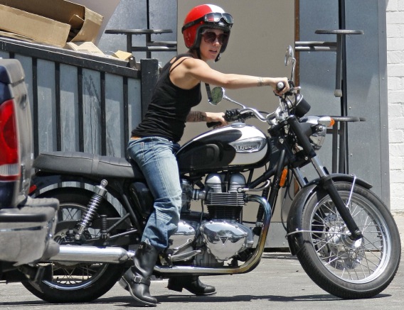 The singer Pink loves her Triumph Bonneville; seen frequently haring around the LA boulevards duckin & diving from paparazzi. Alecia Beth Moore, as she is also known as, takes the biker look somewhat seriously; engineer boots, open-face with nannini goggles; though a nice leather jacket and at least a pair of gloves is recommended!