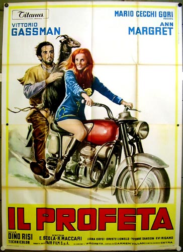 Ann Margaret rides again; the original movie two-wheeled action girl. Here starring in an Italian comedy film: a guru’s groupie plans to seduce him so she can number him among her many conquests. Not sure where the goat fits. This moto looks decidedly like an appropriately selected Guzzi.