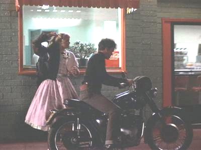 A brief scene in the 1986 movie “Peggy Sue Got Married” shows a classic ride of the time, a pre-unit speed twin Triumph (probably). The rock ‘n’ roll age was blooming, kids were dancin’ to the tunes and the bikes were fast and cool. Kathleen Turner is P.S. and her beau is Nick Cage – later to be the fiery Ghost Rider. The inspiring music is of course the incomparable Buddy Holly.