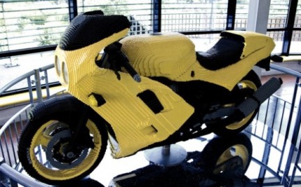 Brick by brick by brick: a full size model Triumph bike constructed entirely of LEGO blocks. The streamlined fairing and black engine superbly fashioned.