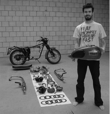 Deconstructed Triumph: yes you can take it apart to see how it works but can you then put it all back together? Here’s a chap with a taste for simian and a future of blood, sweat and gears tears. It reminds me of a classic image of the extremely clever french visual comic actor Jacques Tati.