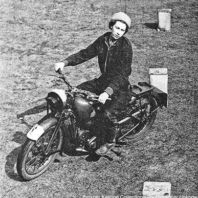 HRH is indeed a Motolady of the past: more than sixty years ago during the Blitz she was giving hands-on support to the ladies in the ATS Auxiliary Training Service. As part of her training, along with engine servicing, tire changing, she also learned to weave adroitly on a wartime spec BSA C10 250cc. Look at the lass go!