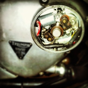 Motorcycle maintenance was on the cards for this morning… Taking out the Boyer electronic ignition and putting the points back in. The garage was hot and humid and after four hours of sweating, kicking, cursing and nearly calling it quits at least three times, it roared to life. Set the timing advance and it settled into a old fashioned twin grumble.