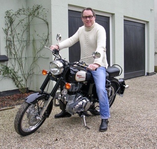 Jim Moir, also known as the other half of Reeves and Mortimer, Vic Reeves enjoys giving his slicked back look a reason to adorn his bonce. He owns and rides a Royal Enfield Bullet.