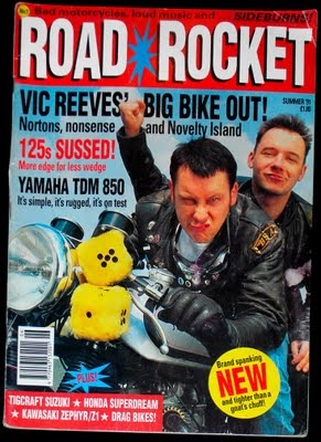 Here are the duo themselves grappling a Norton Manx on the cover of Road Rocket. “Ooh missus! Me fuzzy dice are getting wrapped about my clip-ons!”