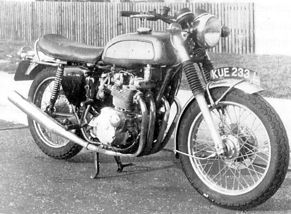 During the slow agonizing decline of the formerly world dominating motorcycle industry, some engineers (Doug Hele) were clutching at ingenious straws to defend themselves from the powerful and reliable machines entering the market from Japan. One curiosity was this litre sized ‘bitsa’ a Trident 750 with another barrel and piston tacked onto the existing threesome gubbins.