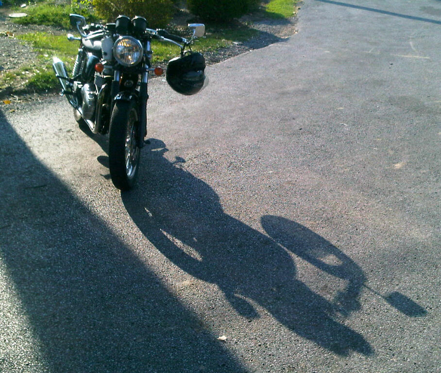 We’re down here in southern Illinois visiting the Shawnee National Forest; picking some fixin’s for supper up at Arnold’s mart I spy this black-on-black Thruxton staring at its own shadow. The cup holder is a curious addition for this cafe inspired ride. “Cup of tea sir?”