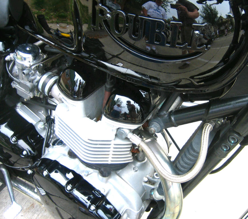 The craft stall that sold the CNC’d moto-motifs also had a ‘Trouble’ plate in Triumph style complete with swooping R. Some ingenious builder has adapted it to his new black Bonnie so you’d better watch out! As they say “If you go lookin’ for it…”