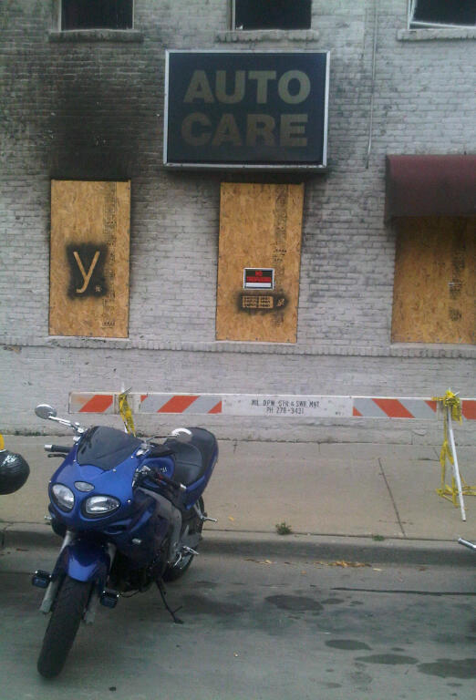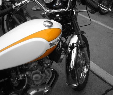 A jaunt up north today saw us over the border to The Dairyland of Wisconsin for a motorcycle street festival. Motos os ALL ages, shapes, sizes and makes were seen. In the hundreds. And all of the machines had their owners touch to them, whether it was a gleaming cover, an oily-rag rubbed engine, or well worn saddle the very emotion of thing two-wheeled was evident and a crowd hearty on draughts of the motorbiking lifestyle could be witnessed. A fire ravaged building for car parts provided an appropriate backdrop to the phoenix of marques: Triumph, here a SuperBlue sprint sits expectantly for their owner to return, crank the engine over and hare off along the nearby Kettle Moraine roads…