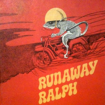 Cover artwork for the classic Ralph story by Beverly Cleary about a mouse who takes off for greener fields atop a mini-moto and encounters adventures. Lovely ink lifework of the rodent and his bike with a two-ink color backdrop and highlight. I especially like the rear paw clutching the foot pedal; and watching out for his tail he conveniently slings it over his shoulder.
