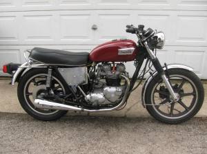 A year after my ’72 Bonnie 650 Triumph updated the model to meet the demands of riders as well as the faster roads. Capacity was increased to 750cc; another gear added for high speed cruising (hence the V in model #); shifting pattern was flipped to the left side, like the asian and american moto market; disc brakes added up front and in’t rear; and cast spoked wheels all combine to achieve an overall functional flair that still makes these machines very roadworthy… put new rubber on the rims (Avon Roadrider), stainless steel brake lines & caliper pistons, Progressive fork springs and Hagon rear shocks and off you go! On offer in Chicago on Craigslist today for $3,500…