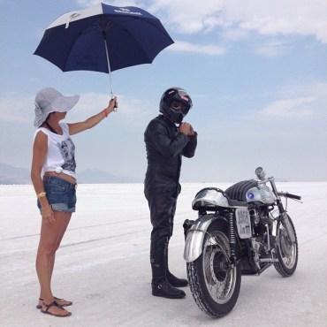 No shade in sight out on the ‘flats’ mate; so bring yer own parasol. Get yer leathers battened down too; that salt can rub an awful welt if you come down. This Bonneville speed freak has a nicely sorted-for-speed Triton: with alloy tins, tank and wheel rims. A tachometer and low-low-low clip-ons. Wide open carb mouths and noisy unmuffled pipes. I bet this one makes a heart thumping sound when wound up in anger!