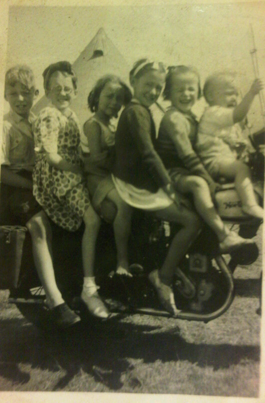 Further to the earlier family snap here it’s companion: the kids camping on the beach cram aboard the Norton steed. My uncles bookend the line-up: David on the tank up front and Jimmy perched atop the pillion pad at the rear. My mother, Joan, sandwiched third from the back. The other kids? Family friends also living wild on the summertime Cresswell Dunes.