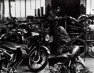 A Moto-mechanics factory: Phil Vincent’s gaff at Stevenage Herts. These images show the rolling assembly line, yes each bike has its own platform, as it would be trundled around the Great North Road plant.
