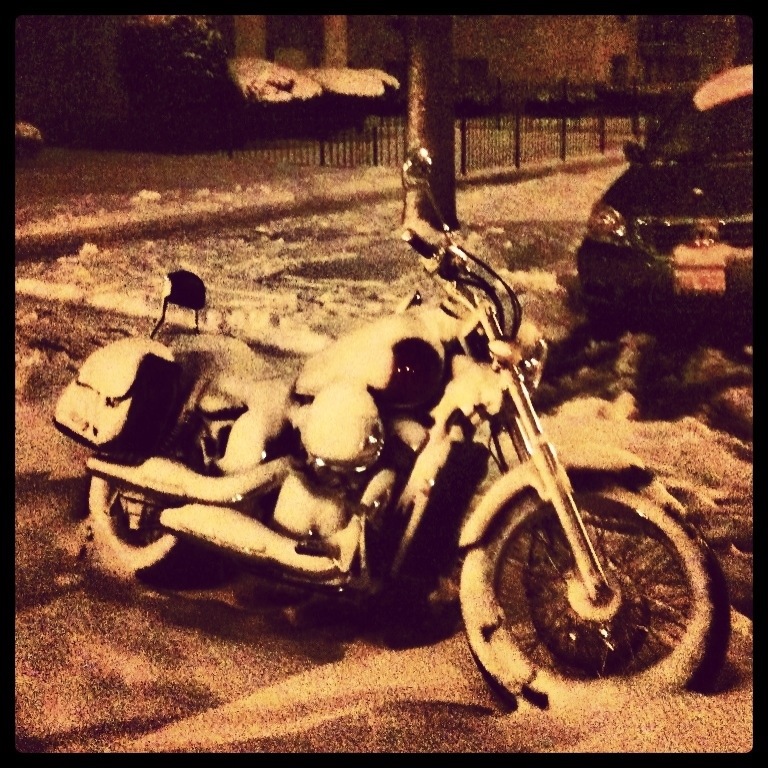 A clean white blanket of snow covers all; not to much to require much digging out mind, but enough to stymie all but the most ardent of riders. Warm clothing, studded tires, and a decent old hack. Not so here in Chicago… The two-wheeled crowd are all inside with their moto’s warmly ensconced ready for that first spring day. Or, having cycle-surgery being undertaken such as my ride. Here are a couple of neglected bikes seen on my local dogwalk. A long legged Suzuki 850 ready for the long haul, and a Honda VT Shadow 750. Both quite sculptural in their wintry cloak.