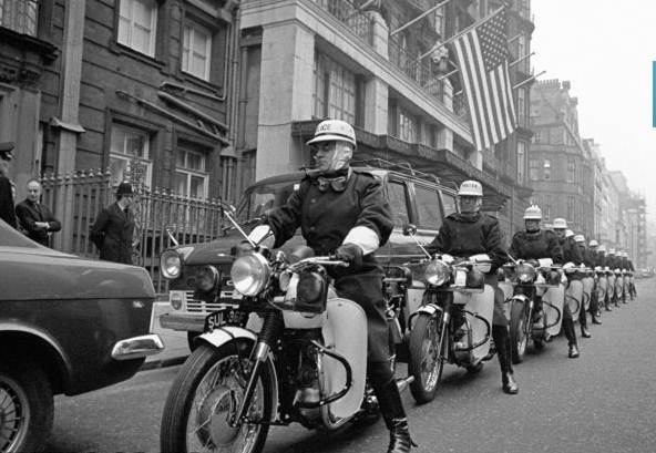 Stops anything in no time: or so goes the acronym for the trusty TR6 Triumphs used as speedy urban transport by the Metropolitan Police. Here are some such heavenly outriders giving Heavy police and security escort for America’s President Richard Nixon who drove from Claridges Hotel to No 10 Downing Street, London for his talks with the Prime Minister, Harold Wilson. The year is 1969.
