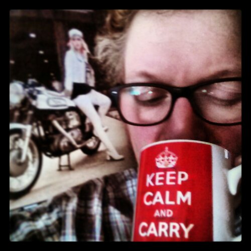 Nowt like a good cuppa when yer get ‘ome from work. Image behind me is a poster picked up at Motoworks last evening; it’s an image of Larry Fletcher’s Triton complete with lovely lass.