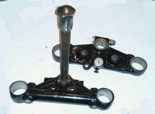 My front end project nears its final lap! My triple tree was returned from the powdercoaters; the grotty item acquired from EBay was bead blasted then given a nice new glossy finish just like it would have looked like from the Midlands factory thirty some years ago. Couple of new bolts to purchase for the lower fork pinch then I can assemble… My easter weekend is fettled for spannerin’ !