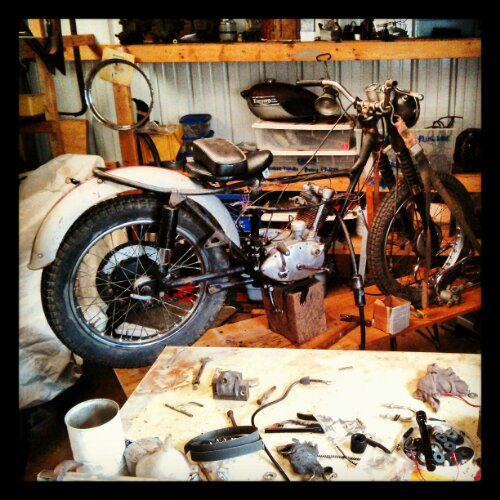 At the weekend when picking up the cub I had a spoach around the sellers workshop. He had a nicely organized garage set up with areas for working on different projects: another Tiger Cub, a Bultaco. There was even a flat track 650 hiding under a tarp. Shelves were lined with boxed and sorted spares, the rafters were draped in exhaust pipes and a daylit window offered good light.