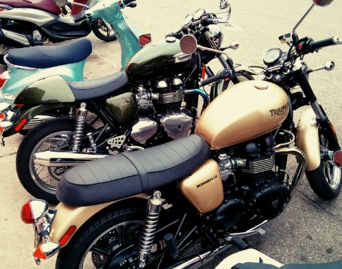 A couple if nice bikes sitting side by side. Here seen down at Motoworks last Saturday when that had an open house. The golden Bonnie in the foreground trying to eclipse the Thruxton behind it… Both are deserved if good homes but I’d make room for the green one… A real smasher and nae doot aboot it