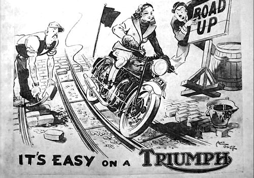 …on a Triumph. A smashing old poster regaling the virtues of two-wheeled transport; even when the roadwork season (summer) hold up traffic. The old tramlines offer a balance beam way over lifted cobbled streets. As always I love the inked brushwork of these classic bike adds. The intent and attire of the gal is spiffy too!
