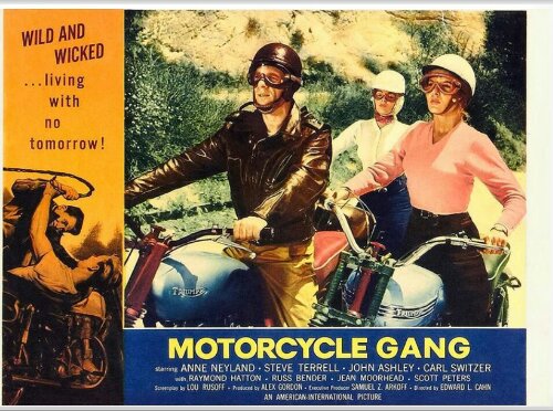 They hare around the dusty Golden State on British iron like there’s no tomorrow, talk ‘sickle lingo, dodge the cops and drag-strip race for kicks. The studio riding shots with projected moving roadway are fun and the writing much to be desired but for a bit of B-Movie antics…