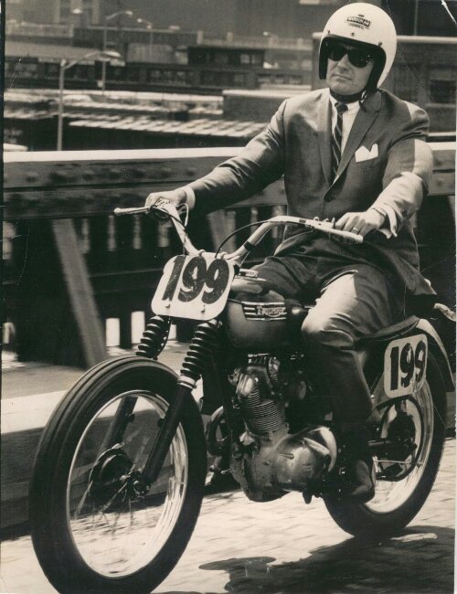 Cutting a dapper figure whilst riding a scrambler sorted Triumph Cub over a Hudson River bridge is the talented racer Don MacShane.