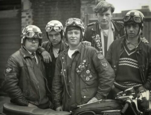 Lad getting together for a weekend on the motorbikes. Leathers, Barbour, bin lids and a good craic. I can eve guess their nicknames; from left to right: Pud’n, Chaz, Peachy, Lofty, and Swiftly Mike. Out for a hare along the A57 from Sheffield to Glossop.