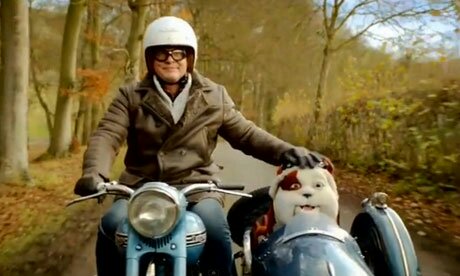 British bulldog fronted UK insurance company Churchill has jug-eared actor Martin Clunes haring around the English countryside with the company’s titular mascot as passenger in a sky blue Triumph combination.