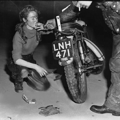 Here’s a gal enjoying a little repair needs on her Triumph Cub and getting a drag from a cig off her riding pal.